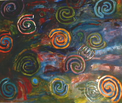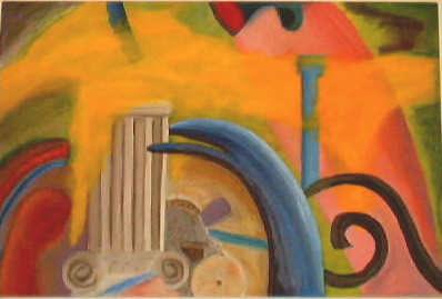 This is my most recent painting done for my Painting I class at TCU (fall 2001). It is a painting of chance. Before we started, my class mates and I were partnered up by drawing keys and matching them up with each other and then going into another room. In the room we sat down and opened dictionaries for one another, closed our eyes, then picked out a word with our fingers. My words were standard, another word for microscopic lens, and there were a few other words that I cannot remember. |