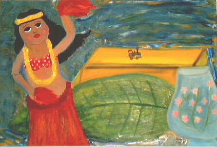 This was done in my painting I class (fall 2001). It is a still life with some personal objects. The Hawaiian girl I got from my trip to Hawaii and the train was given to me by my Grandfather Moore who went to Purdue. It seems as if these playful objects are coming from out side the box which is the yellow orange rectangle in the center.