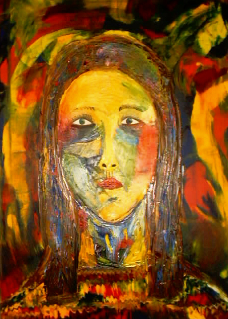 This is a self Portrait that was done in my painting I class (fall 2001). The assignment started with a color collage with the colors of your choice. We then incorporated these colors into the painting. I believe that this was my
