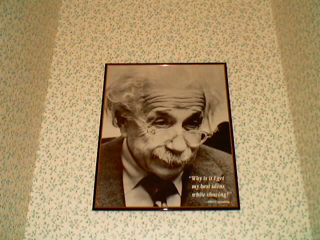 Guys, if you come to are apartment and use Ambers bathroom, this is what Amber has put up for you to look at while u go to the bathroom! It is hard to make out the text from the picture but it says "Why is it I get the best ideas while shaving?" (Dec 2001) |